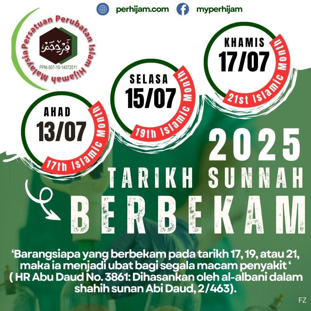 Dapatkan peluang berbekam pada tarikh-tarikh sunnah ini di setiap pusat rawatan bekam.